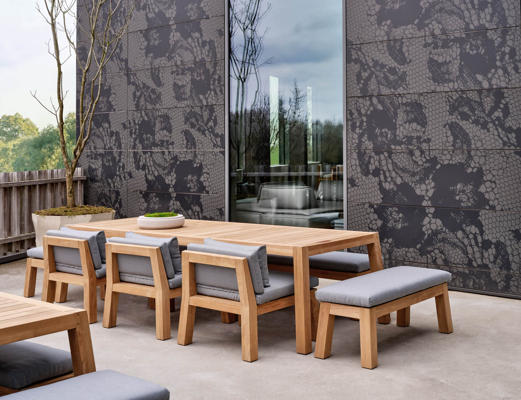 Ножки уличной скамьи Niek Bench изготовлены из тикового дерева. Фурнитура стальная. Модель выполнена из полиуретана. Обивка модели — ткань.