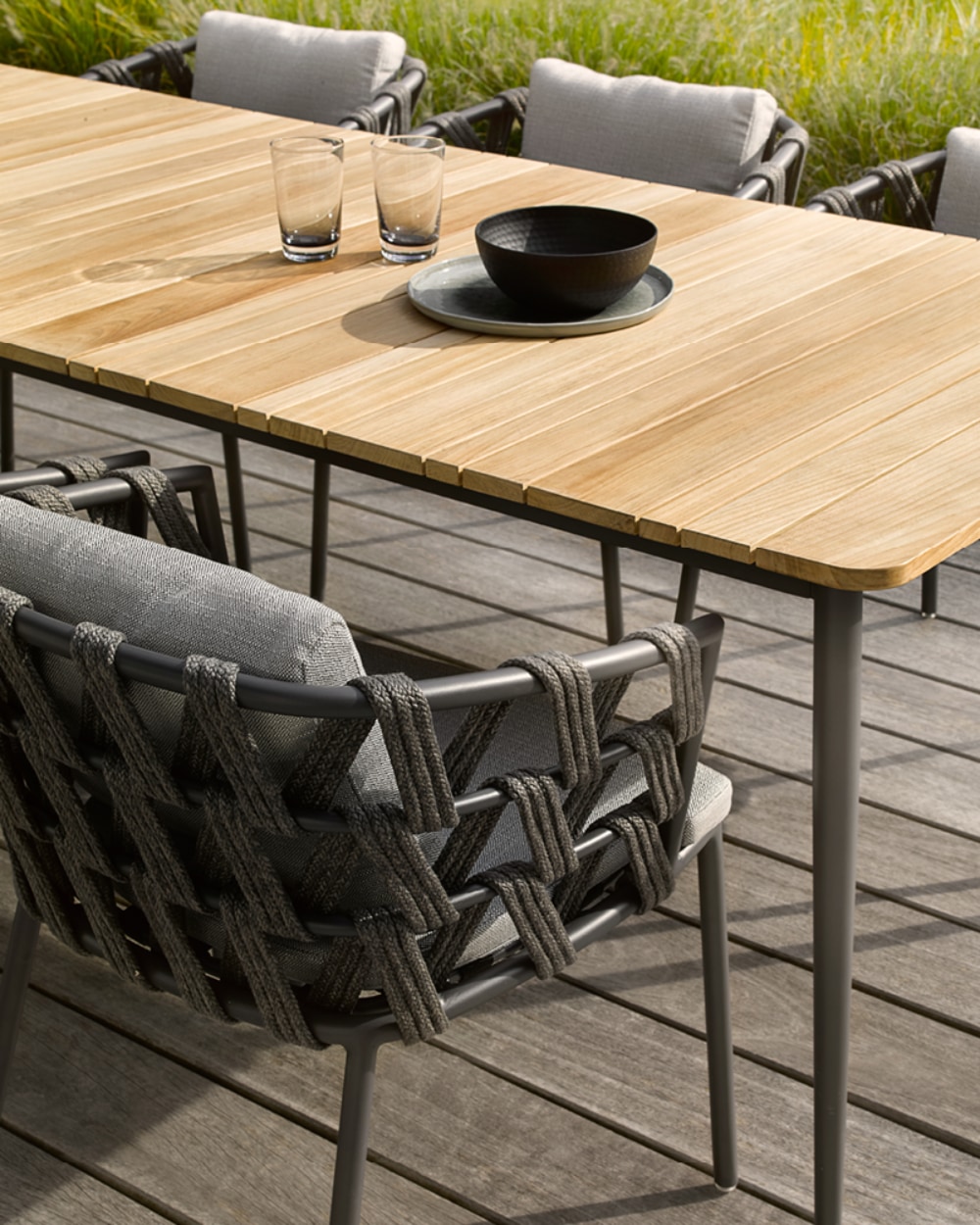 Ножки выполнены из алюминия, столешница – из натурального тика.