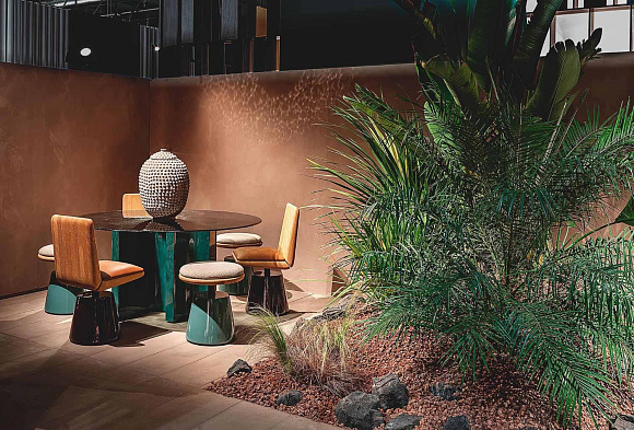 Как заявляет дизайн-студия Studiopepe, создавшая уличный стол Baxter Dharma Table, предмет был выполнен в стиле постмодернистского эклектизма. Классическая для итальянской мебели столешница из дымчатого стекла сочетается с блестящим основанием геометричной формы.