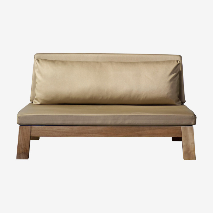 Ножки уличного дивана Gijs Loveseat изготовлены из тикового дерева. Сиденье и спинка сделаны из полиуретана. Обивка модели — ткань.