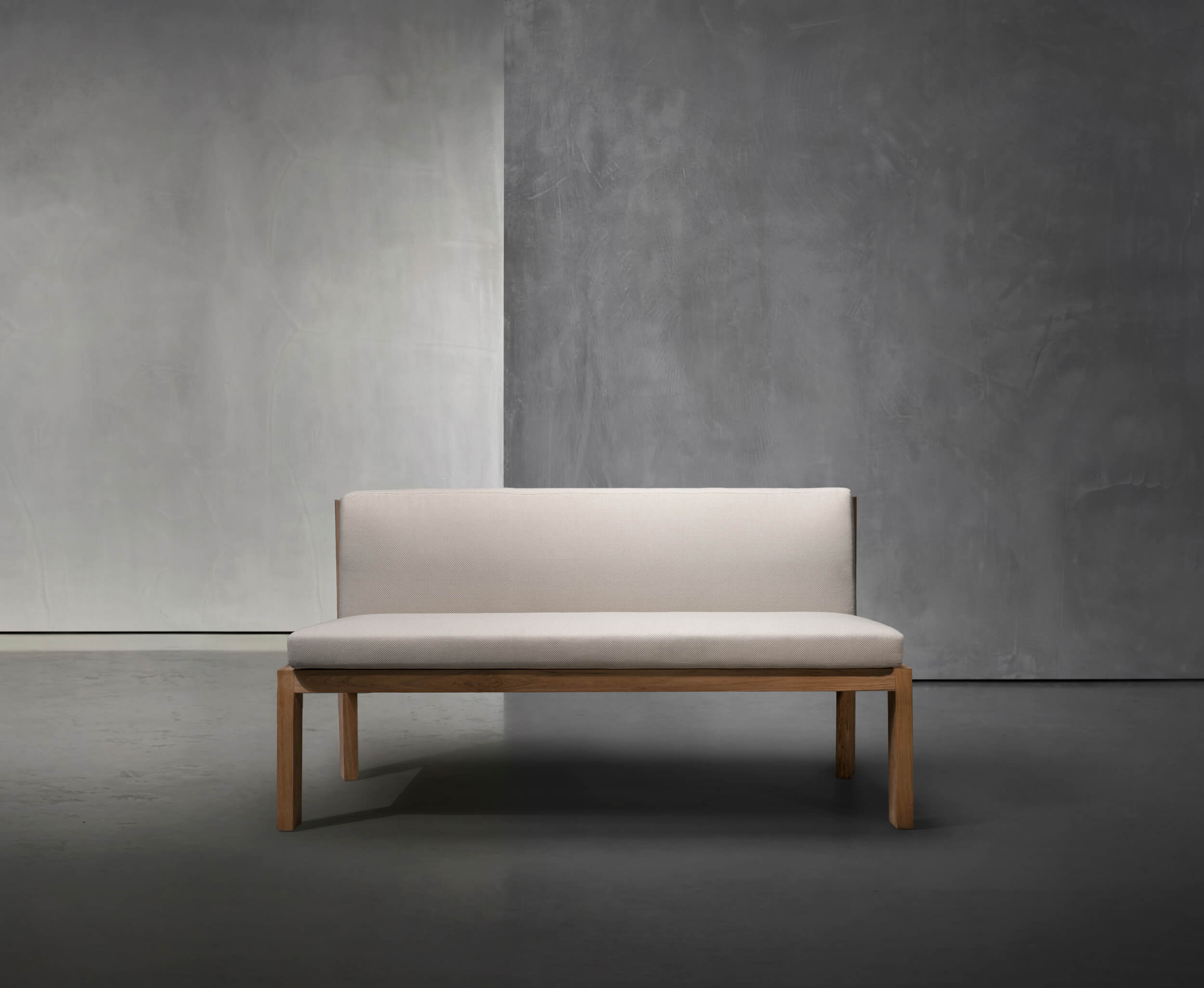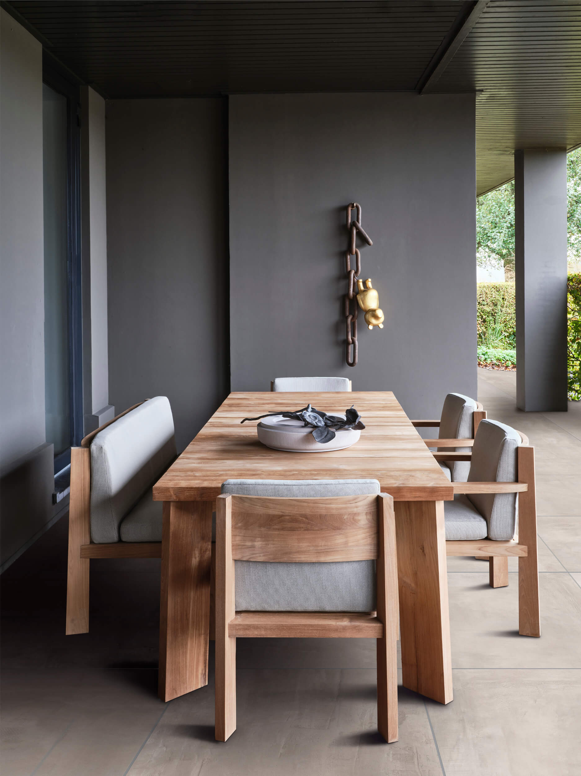 Уличный диван Timme Dining Sofa изготовлен из тикового дерева. Обивка модели — ткань.