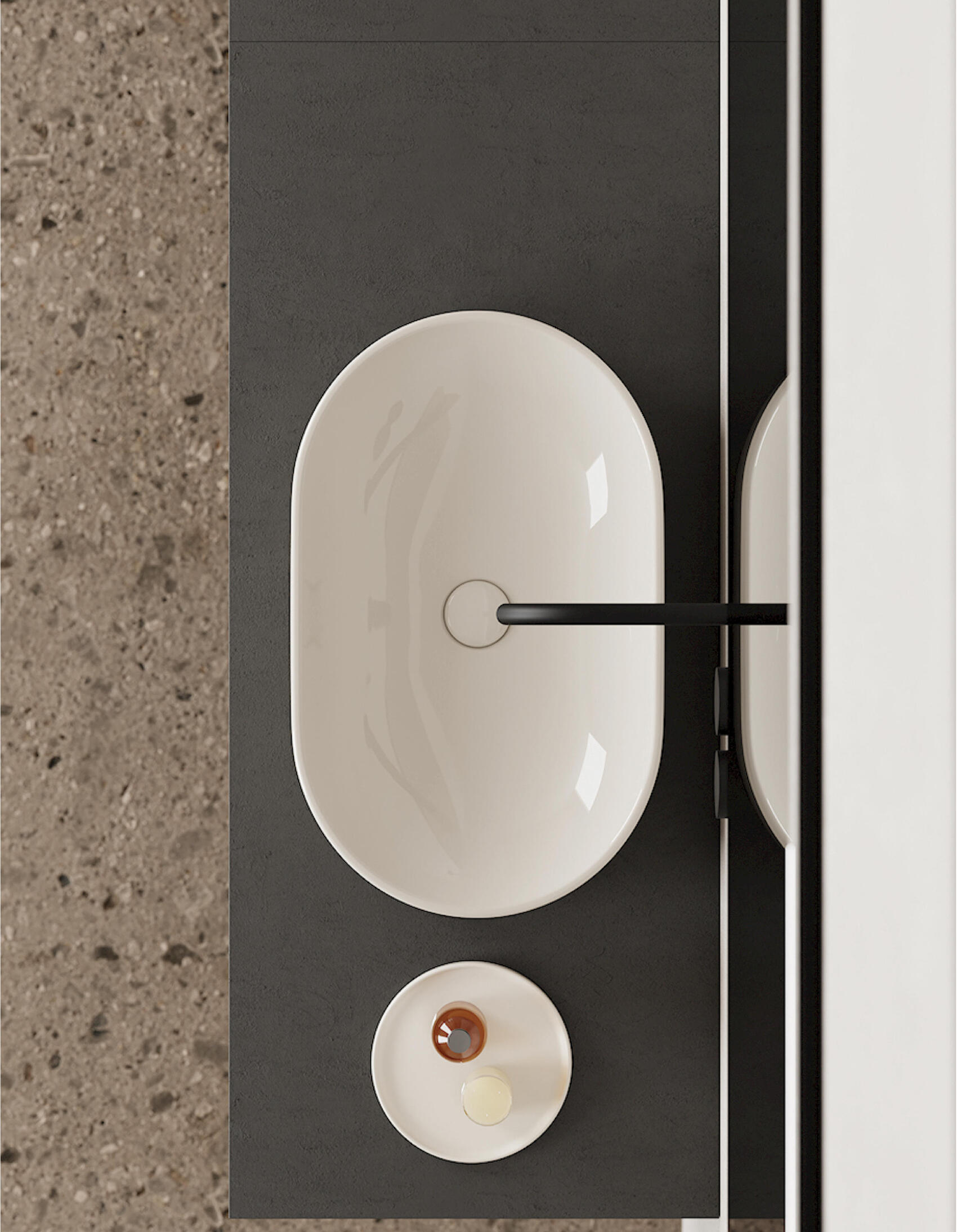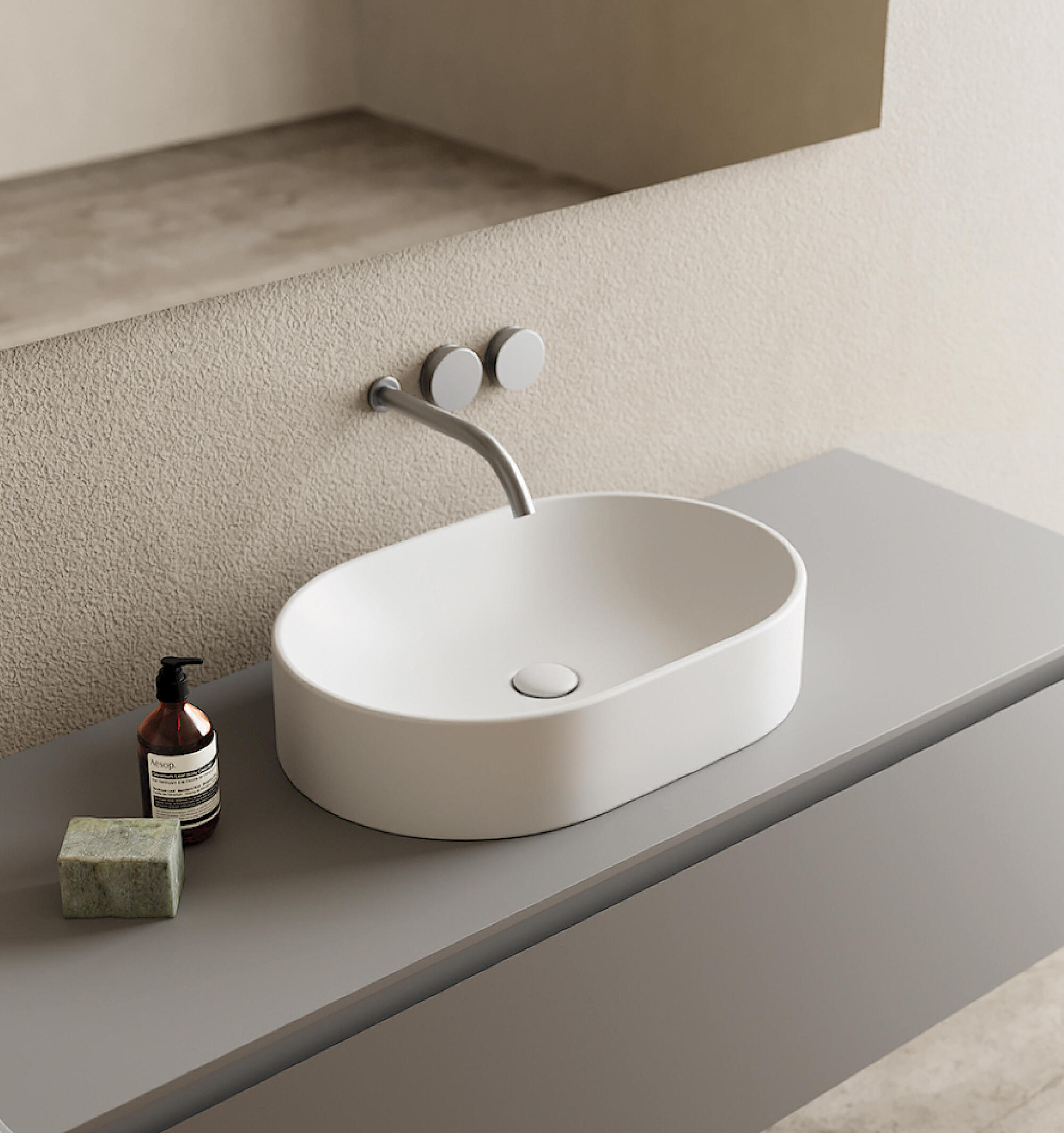 Накладная раковина без перелива NIC Design Pin Washbasin — удобная настольная версия с глубокой удлинённой чашей мягкой овальной формы.Раковина доступна в двух размерах: 55x37x12, 60x37x12.