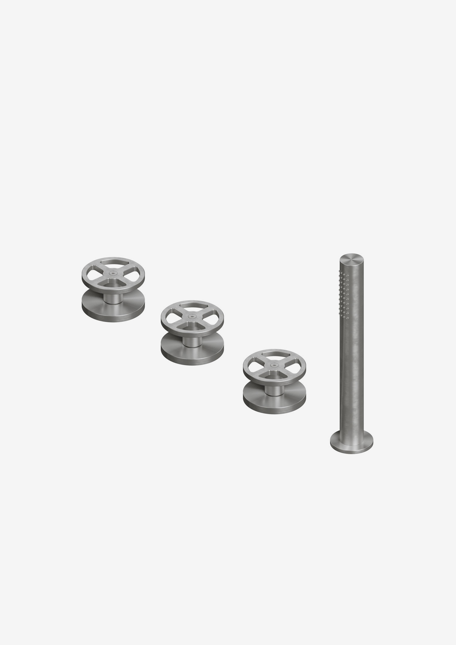Душевой комплект Quadro Design Valvola02 20 99 поставляется с ручным душем, предназначенным для крепления на борт ванны и подключаемым к гидропрогрессивному смесителю. Также в наборе идёт комплект традиционных переключателей для смесителя.