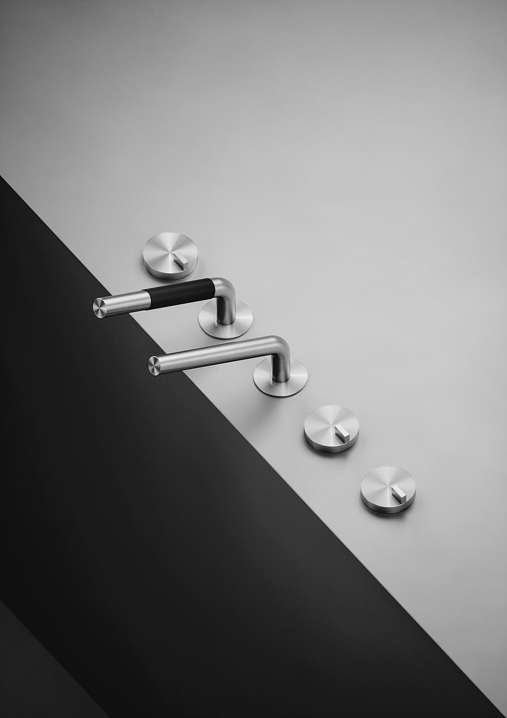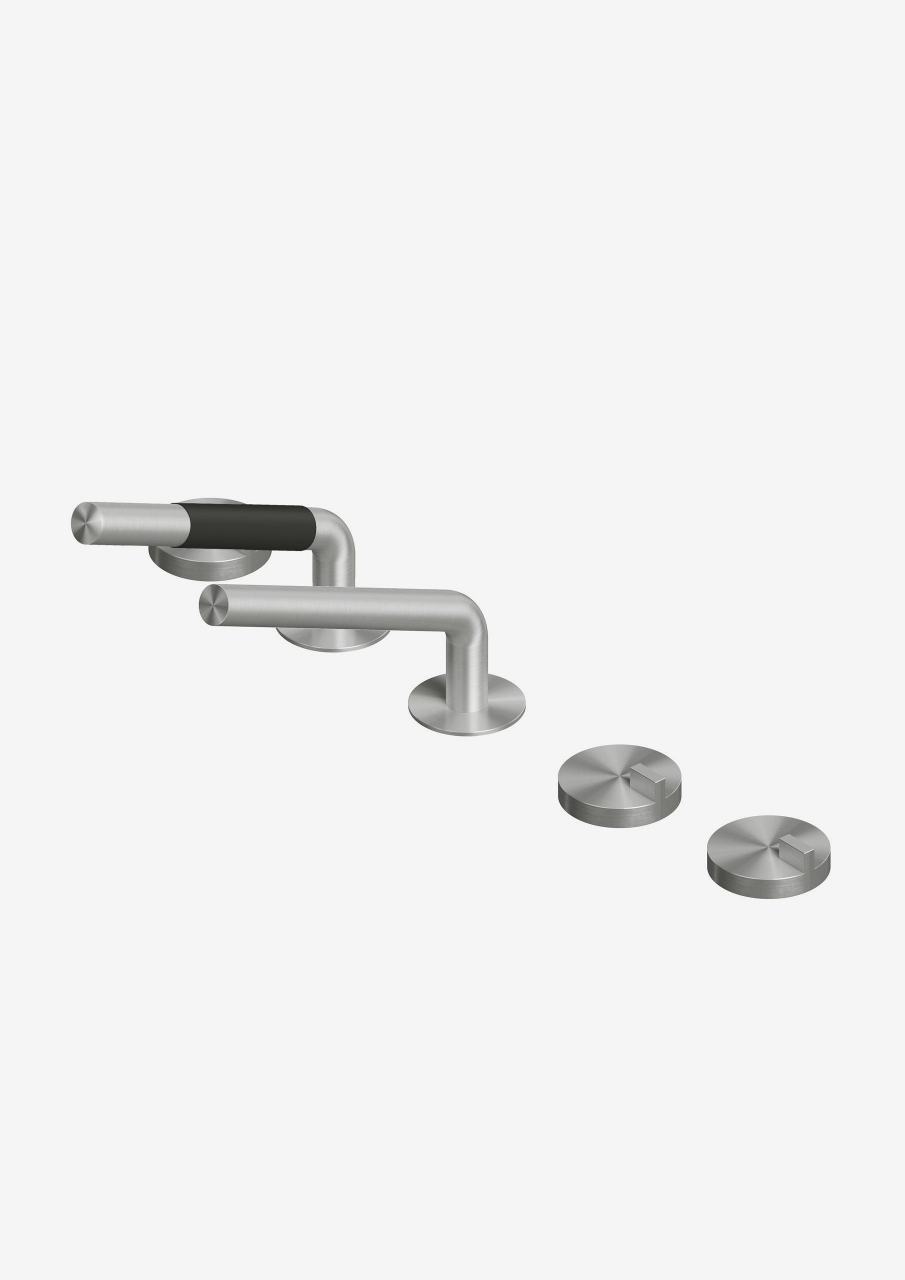 Комплект смесителей на борт ванны Quadro Design Q 18 98 включает смеситель на три отверстия с поворотным изливом и гидропрогрессивный смеситель с ручным душем.