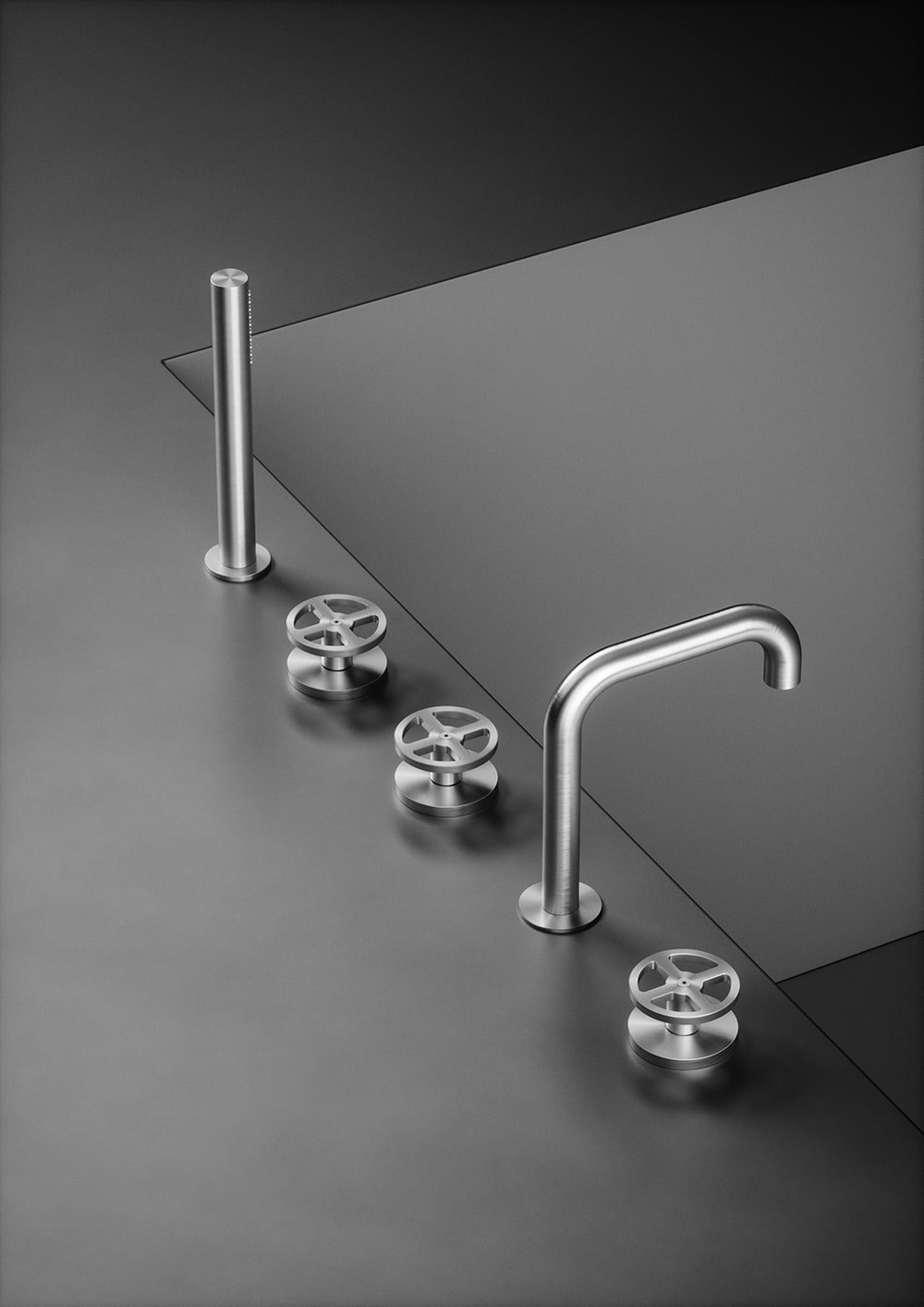 Смеситель на борт ванны Quadro Design Valvola02 20 98 поставляется с комплектом переключателей стандартного типа и ручным душем с отдельным гидропрогрессивным переключателем.