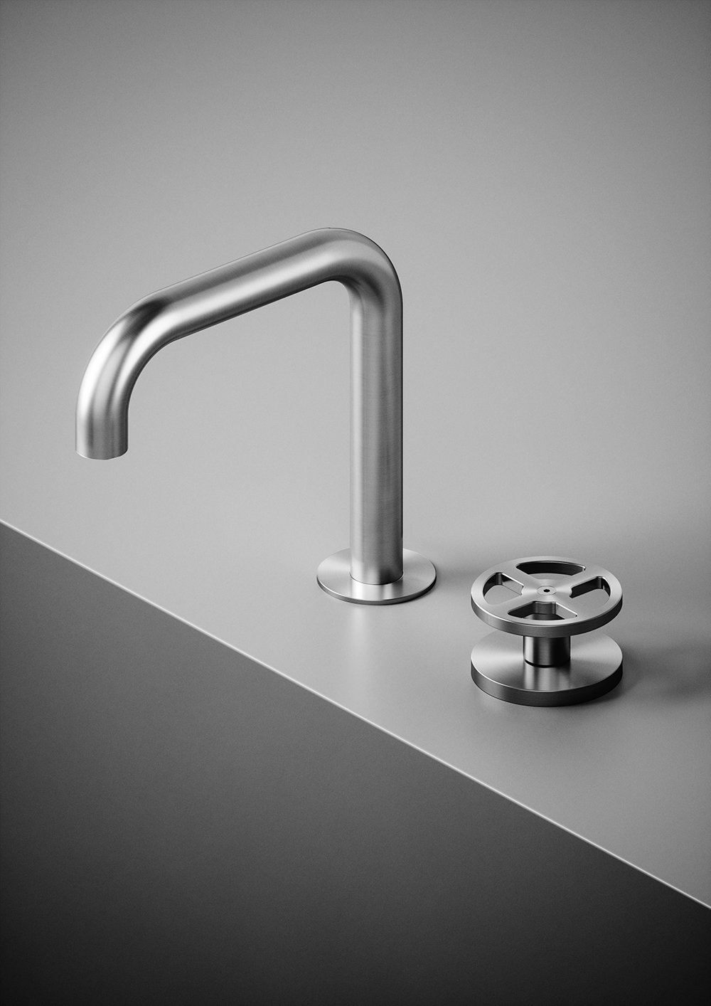 Смеситель на раковину Quadro Design Valvola02 20 31 / 20 32 обладает изогнутым основанием. Он поставляется с гидропрогрессивным вентилем, отвечающим за регулировку температуры и давления воды.