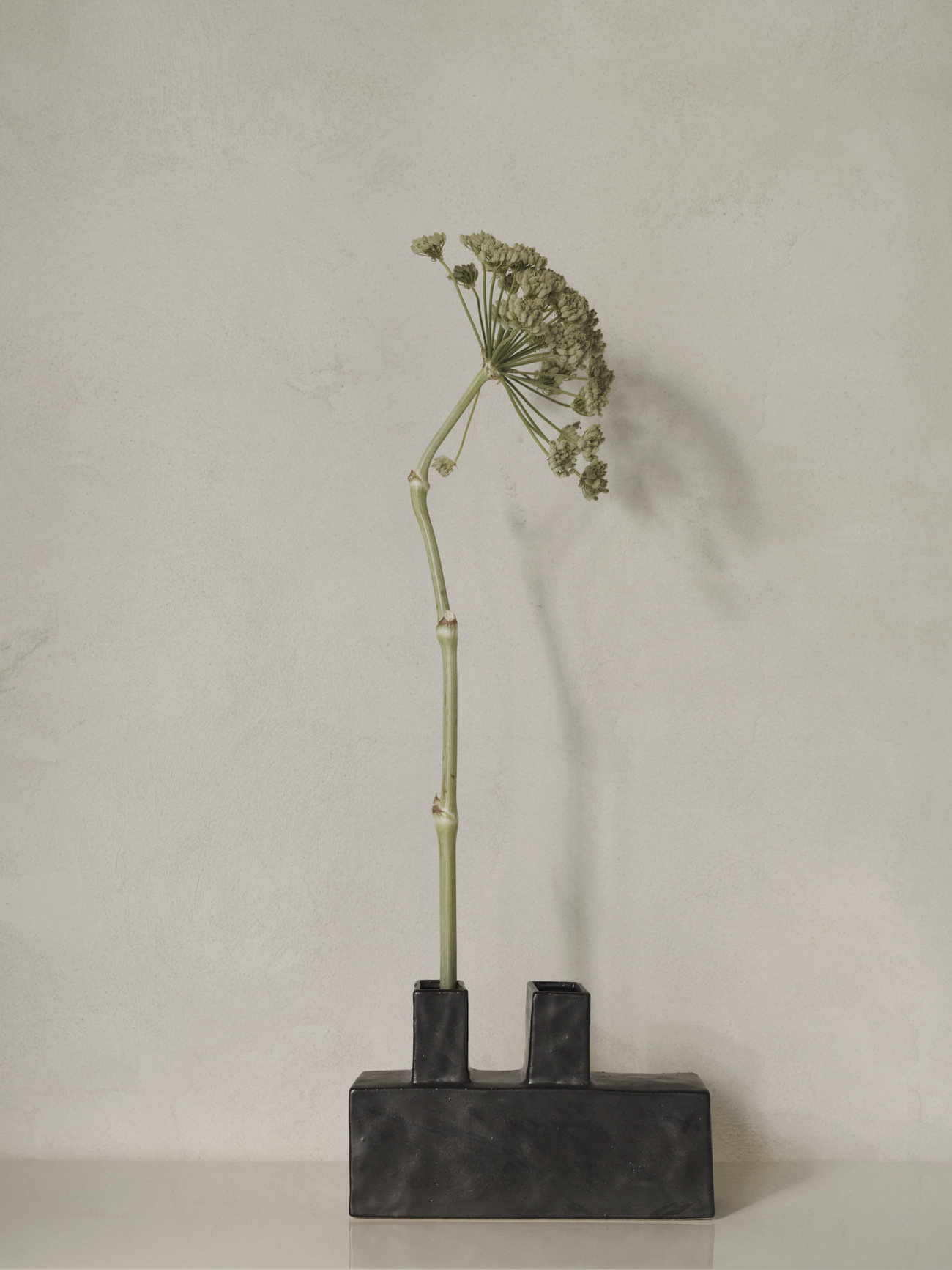 Ваза Ferm Living Koa Double переосмысляет бруталистскую эстетику через призму уютного скандинавского дизайна. Название вазы, означающее «воин», находит отражение в её строгом уверенном силуэте. Глубокий чёрный цвет и матовая текстура подчёркивают превращают модель Koa Double в доминирующий акцент любого пространства.